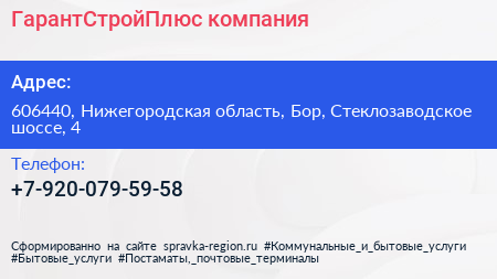 ГарантСтройПлюс, компания по адресу 606440, Нижегородская область, Бор, Стеклозаводское шоссе, 4 в дальнейшем Организация, размещена в следующих категориях: