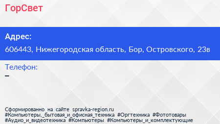 ГорСвет по адресу 606443, Нижегородская область, Бор, Островского, 23в в дальнейшем Организация, размещена в следующих категориях: