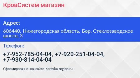 КровСистем, магазин по адресу 606440, Нижегородская область, Бор, Стеклозаводское шоссе, 3 в дальнейшем Организация, размещена в следующих категориях: