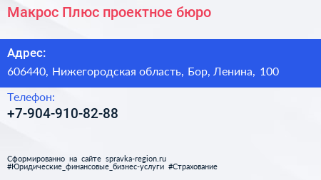 Макрос Плюс, проектное бюро по адресу 606440, Нижегородская область, Бор, Ленина, 100 в дальнейшем Организация, размещена в следующих категориях: