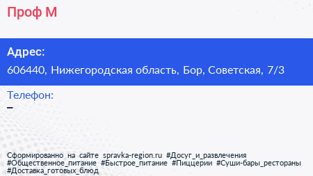 Проф-М по адресу 606440, Нижегородская область, Бор, Советская, 7/3 в дальнейшем Организация, размещена в следующих категориях: