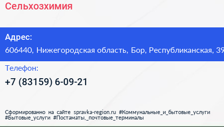 Сельхозхимия по адресу 606440, Нижегородская область, Бор, Республиканская, 39 в дальнейшем Организация, размещена в следующих категориях: