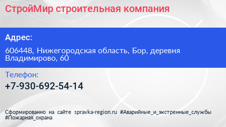 СтройМир, строительная компания по адресу 606448, Нижегородская область, Бор, деревня Владимирово, 60 в дальнейшем Организация, размещена в следующих категориях: