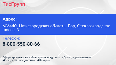 ТисГрупп по адресу 606440, Нижегородская область, Бор, Стеклозаводское шоссе, 3 в дальнейшем Организация, размещена в следующих категориях: