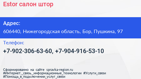Estor, салон штор по адресу 606440, Нижегородская область, Бор, Пушкина, 97 в дальнейшем Организация, размещена в следующих категориях: