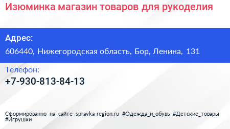 Изюминка, магазин товаров для рукоделия по адресу 606440, Нижегородская область, Бор, Ленина, 131 в дальнейшем Организация, размещена в следующих категориях: