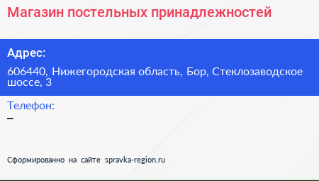 Магазин постельных принадлежностей по адресу 606440, Нижегородская область, Бор, Стеклозаводское шоссе, 3 в дальнейшем Организация, размещена в следующих категориях: