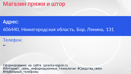 Магазин пряжи и штор по адресу 606440, Нижегородская область, Бор, Ленина, 131 в дальнейшем Организация, размещена в следующих категориях:
