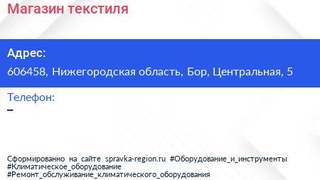 Магазин текстиля по адресу 606458, Нижегородская область, Бор, Центральная, 5 в дальнейшем Организация, размещена в следующих категориях: