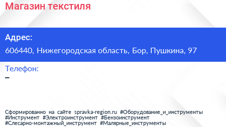 Магазин текстиля по адресу 606440, Нижегородская область, Бор, Пушкина, 97 в дальнейшем Организация, размещена в следующих категориях: