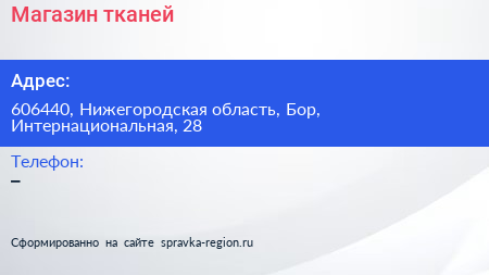 Магазин тканей по адресу 606440, Нижегородская область, Бор, Интернациональная, 28 в дальнейшем Организация, размещена в следующих категориях: