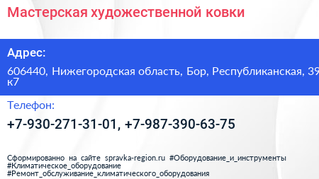 Мастерская художественной ковки по адресу 606440, Нижегородская область, Бор, Республиканская, 39 к7 в дальнейшем Организация, размещена в следующих категориях: