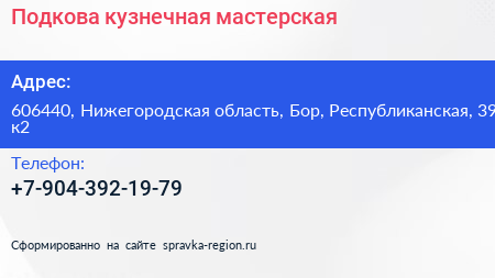 Подкова, кузнечная мастерская по адресу 606440, Нижегородская область, Бор, Республиканская, 39 к2 в дальнейшем Организация, размещена в следующих категориях:
