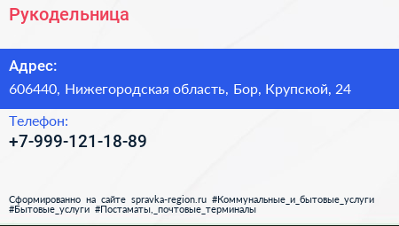 Рукодельница по адресу 606440, Нижегородская область, Бор, Крупской, 24 в дальнейшем Организация, размещена в следующих категориях: