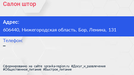 Салон штор по адресу 606440, Нижегородская область, Бор, Ленина, 131 в дальнейшем Организация, размещена в следующих категориях: