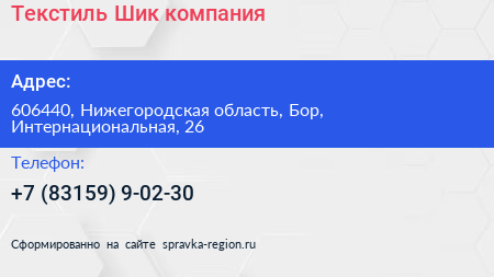 Текстиль Шик, компания по адресу 606440, Нижегородская область, Бор, Интернациональная, 26 в дальнейшем Организация, размещена в следующих категориях: