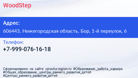 WoodStep по адресу 606443, Нижегородская область, Бор, 1-й переулок, 6 в дальнейшем Организация, размещена в следующих категориях: