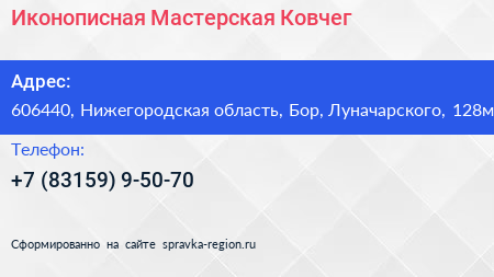 Иконописная Мастерская Ковчег по адресу 606440, Нижегородская область, Бор, Луначарского, 128м в дальнейшем Организация, размещена в следующих категориях: