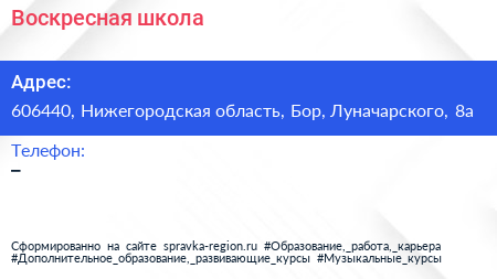 Воскресная школа по адресу 606440, Нижегородская область, Бор, Луначарского, 8а в дальнейшем Организация, размещена в следующих категориях: