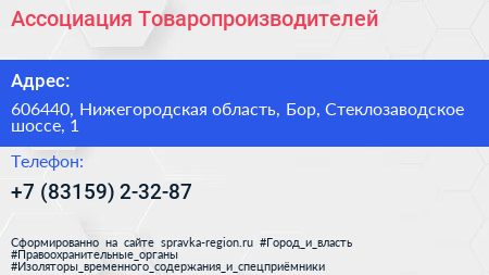 Ассоциация Товаропроизводителей по адресу 606440, Нижегородская область, Бор, Стеклозаводское шоссе, 1 в дальнейшем Организация, размещена в следующих категориях: