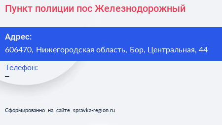 Пункт полиции, пос. Железнодорожный по адресу 606470, Нижегородская область, Бор, Центральная, 44 в дальнейшем Организация, размещена в следующих категориях: