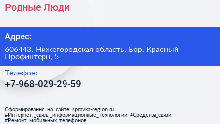 Родные Люди по адресу 606443, Нижегородская область, Бор, Красный Профинтерн, 5 в дальнейшем Организация, размещена в следующих категориях:
