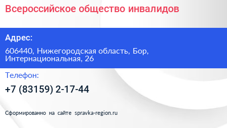 Всероссийское общество инвалидов по адресу 606440, Нижегородская область, Бор, Интернациональная, 26 в дальнейшем Организация, размещена в следующих категориях: