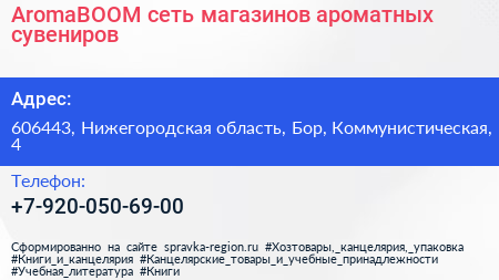 AromaBOOM, сеть магазинов ароматных сувениров по адресу 606443, Нижегородская область, Бор, Коммунистическая, 4 в дальнейшем Организация, размещена в следующих категориях: