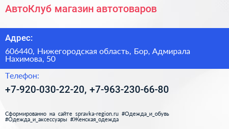 АвтоКлуб, магазин автотоваров по адресу 606440, Нижегородская область, Бор, Адмирала Нахимова, 50 в дальнейшем Организация, размещена в следующих категориях: