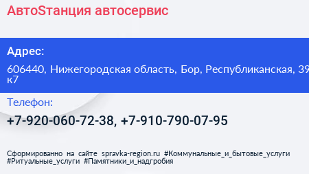 АвтоSтанция, автосервис по адресу 606440, Нижегородская область, Бор, Республиканская, 39 к7 в дальнейшем Организация, размещена в следующих категориях: