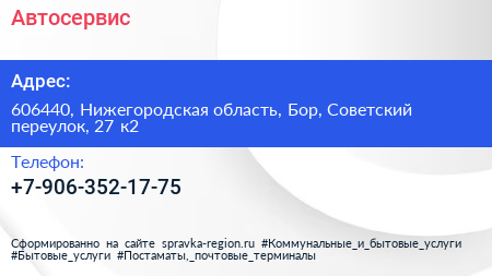 Автосервис по адресу 606440, Нижегородская область, Бор, Советский переулок, 27 к2 в дальнейшем Организация, размещена в следующих категориях: