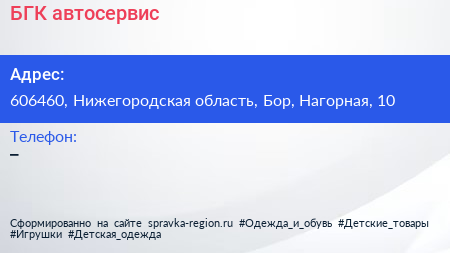 БГК, автосервис по адресу 606460, Нижегородская область, Бор, Нагорная, 10 в дальнейшем Организация, размещена в следующих категориях: