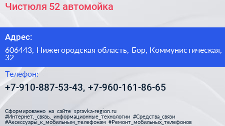 Чистюля 52, автомойка по адресу 606443, Нижегородская область, Бор, Коммунистическая, 32 в дальнейшем Организация, размещена в следующих категориях: