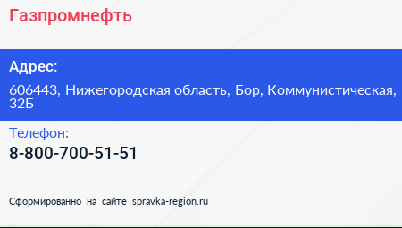 Газпромнефть по адресу 606443, Нижегородская область, Бор, Коммунистическая, 32Б в дальнейшем Организация, размещена в следующих категориях: