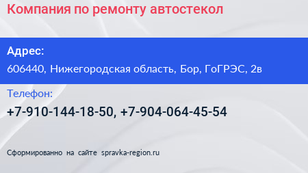 Компания по ремонту автостекол по адресу 606440, Нижегородская область, Бор, ГоГРЭС, 2в в дальнейшем Организация, размещена в следующих категориях: