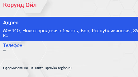 Корунд Ойл по адресу 606440, Нижегородская область, Бор, Республиканская, 39 к1 в дальнейшем Организация, размещена в следующих категориях: