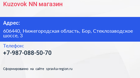 Kuzovok.NN, магазин по адресу 606440, Нижегородская область, Бор, Стеклозаводское шоссе, 3 в дальнейшем Организация, размещена в следующих категориях: