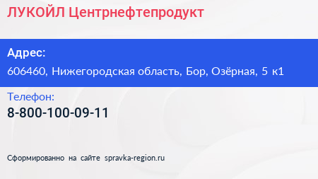 ЛУКОЙЛ-Центрнефтепродукт по адресу 606460, Нижегородская область, Бор, Озёрная, 5 к1 в дальнейшем Организация, размещена в следующих категориях:
