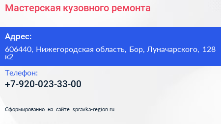 Мастерская кузовного ремонта по адресу 606440, Нижегородская область, Бор, Луначарского, 128 к2 в дальнейшем Организация, размещена в следующих категориях: