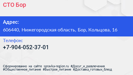 СТО Бор по адресу 606440, Нижегородская область, Бор, Кольцова, 16 в дальнейшем Организация, размещена в следующих категориях: