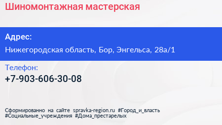 Шиномонтажная мастерская по адресу Нижегородская область, Бор, Энгельса, 28а/1 в дальнейшем Организация, размещена в следующих категориях: