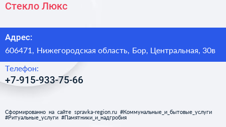 Стекло-Люкс по адресу 606471, Нижегородская область, Бор, Центральная, 30в в дальнейшем Организация, размещена в следующих категориях: