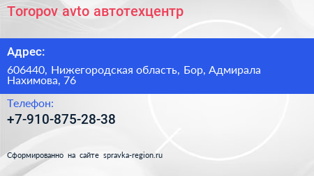 Toropov-avto, автотехцентр по адресу 606440, Нижегородская область, Бор, Адмирала Нахимова, 76 в дальнейшем Организация, размещена в следующих категориях: