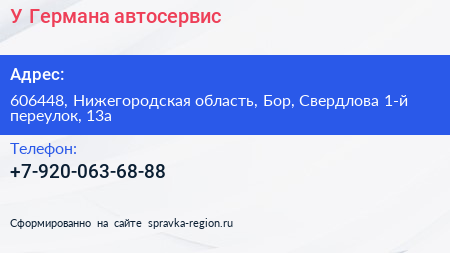 У Германа, автосервис по адресу 606448, Нижегородская область, Бор, Свердлова 1-й переулок, 13а в дальнейшем Организация, размещена в следующих категориях: