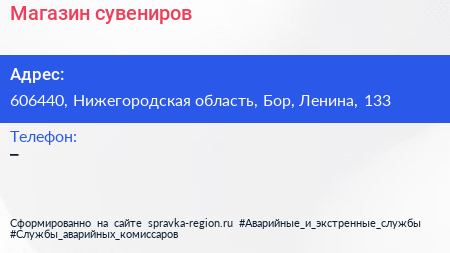 Магазин сувениров по адресу 606440, Нижегородская область, Бор, Ленина, 133 в дальнейшем Организация, размещена в следующих категориях: