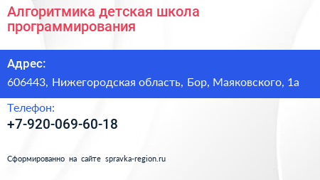Алгоритмика, детская школа программирования по адресу 606443, Нижегородская область, Бор, Маяковского, 1а в дальнейшем Организация, размещена в следующих категориях: