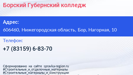 Борский Губернский колледж по адресу 606460, Нижегородская область, Бор, Нагорная, 10 в дальнейшем Организация, размещена в следующих категориях: