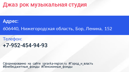Джаз-рок, музыкальная студия по адресу 606440, Нижегородская область, Бор, Ленина, 152 в дальнейшем Организация, размещена в следующих категориях: