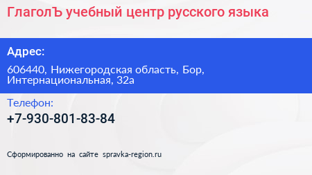 ГлаголЪ, учебный центр русского языка по адресу 606440, Нижегородская область, Бор, Интернациональная, 32а в дальнейшем Организация, размещена в следующих категориях: