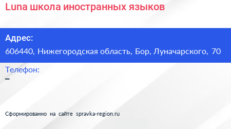Luna, школа иностранных языков по адресу 606440, Нижегородская область, Бор, Луначарского, 70 в дальнейшем Организация, размещена в следующих категориях: